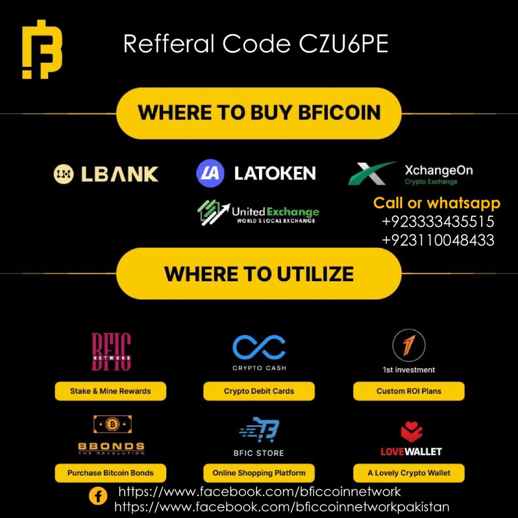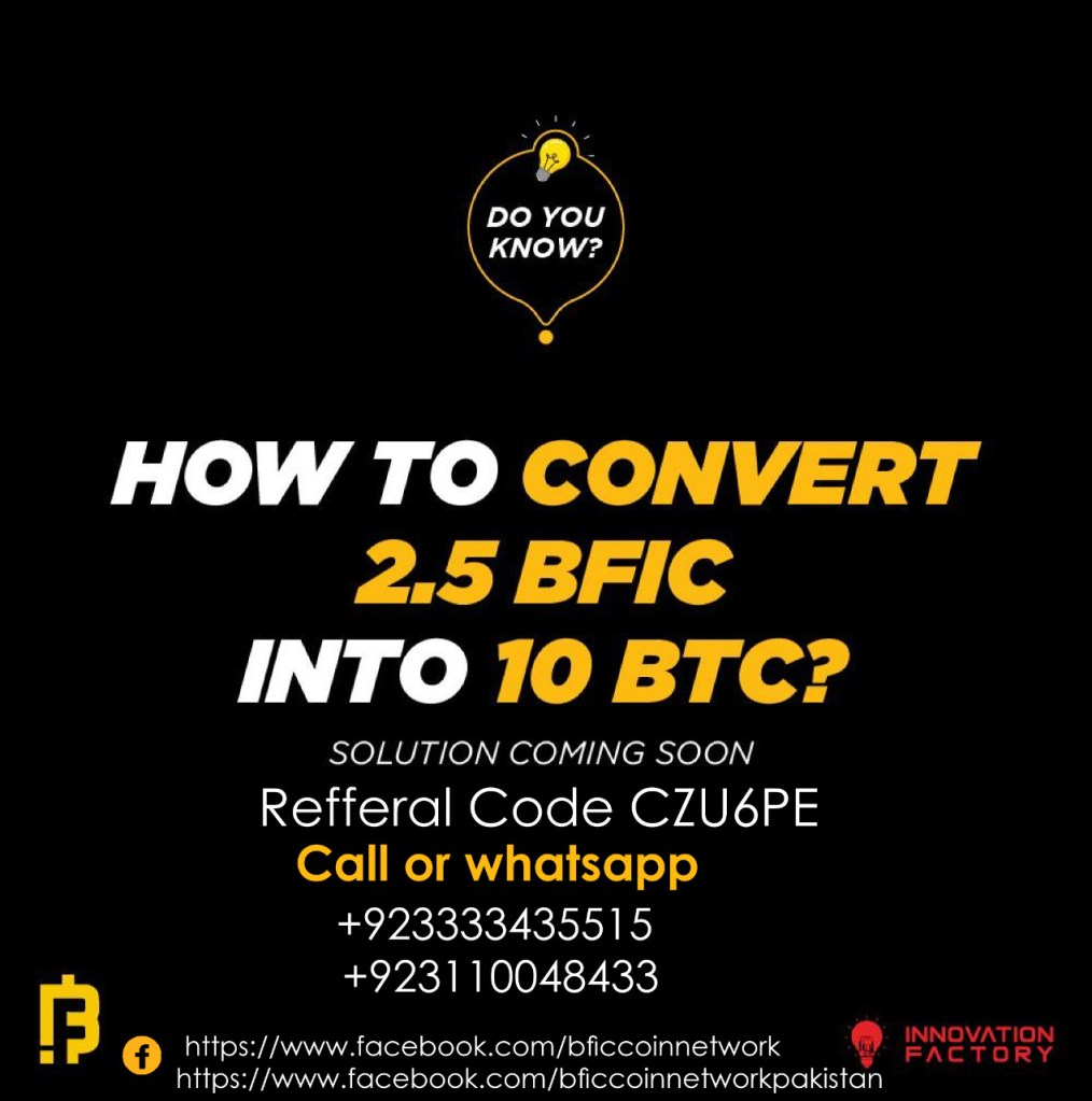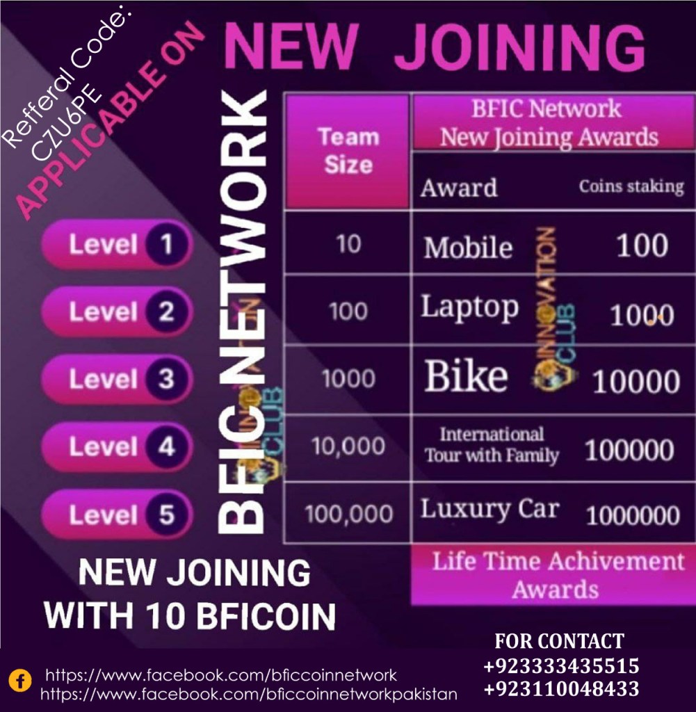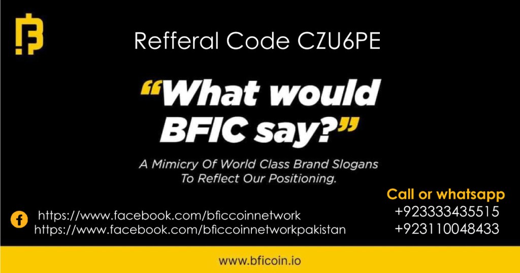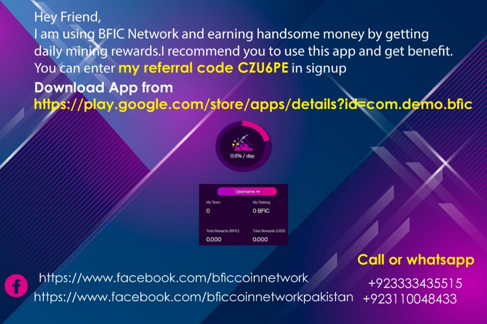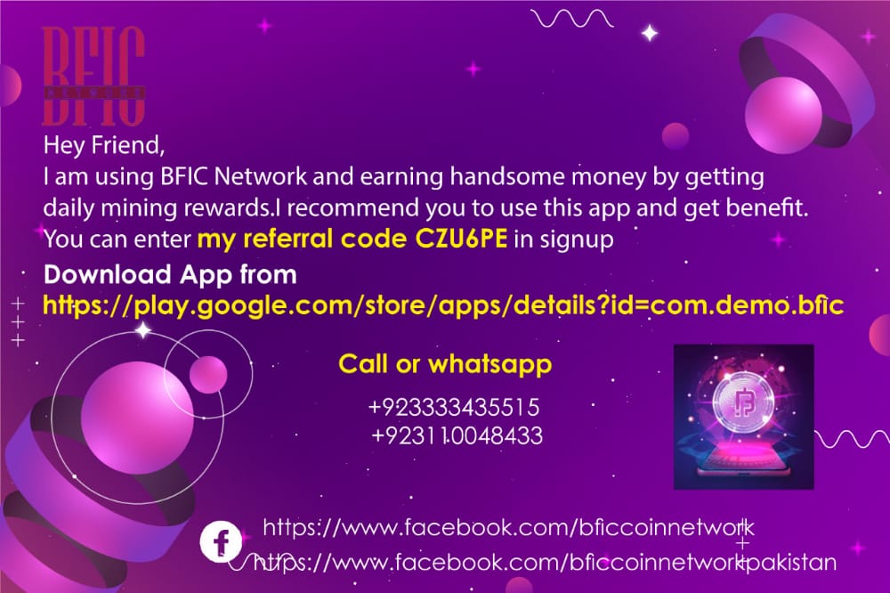 Hey Friend, I am using BFIC Network and earning handsome money by getting daily mining rewards.I recommend you to use this app and get benefit.You can enter my referral code *YGHD6R* in signup.Download App from https://play.google.com/store/apps/details?id=com.demo.bfic